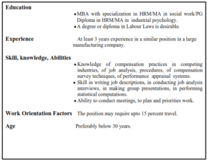 If the job requires any special skills, knowledge and ability like extensive travelling, working at odd hours, and good memory power, it should be clearly mentioned.
